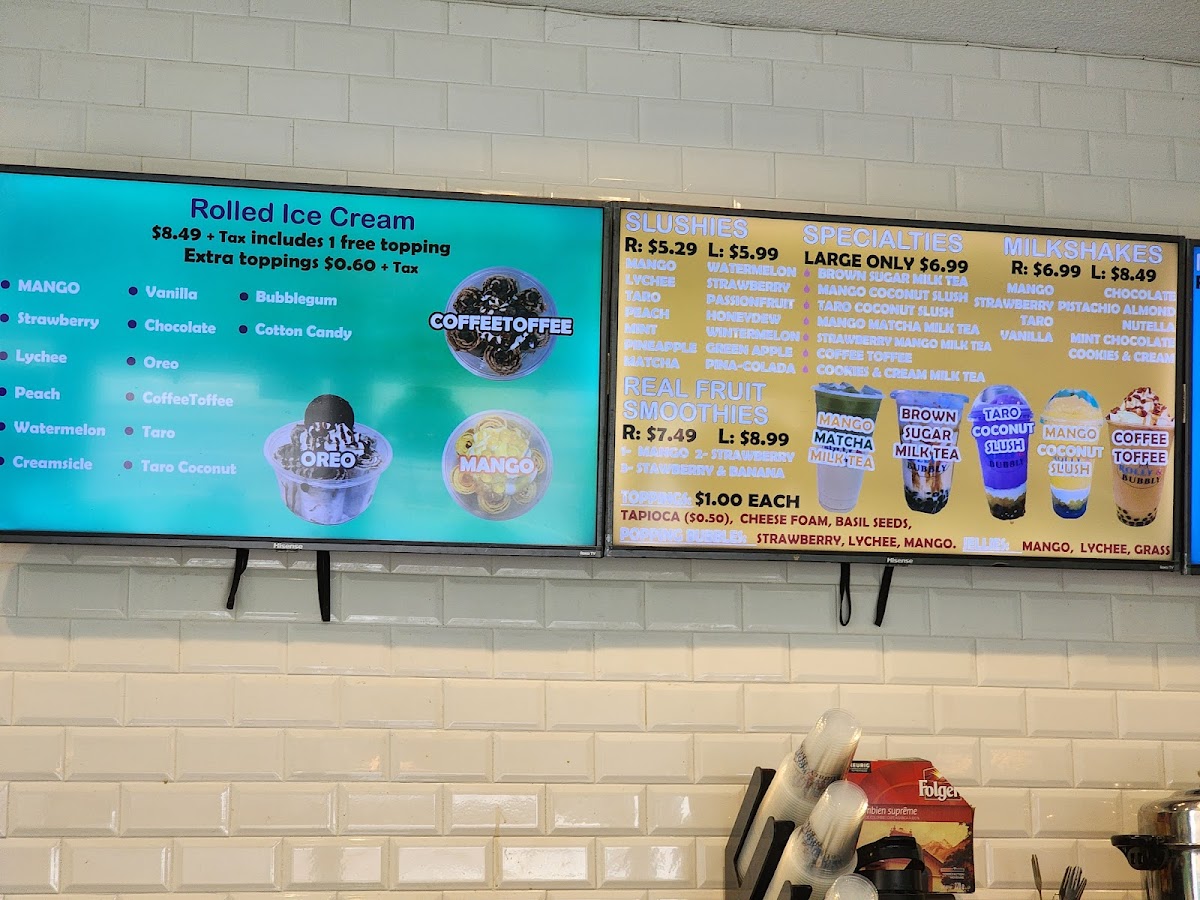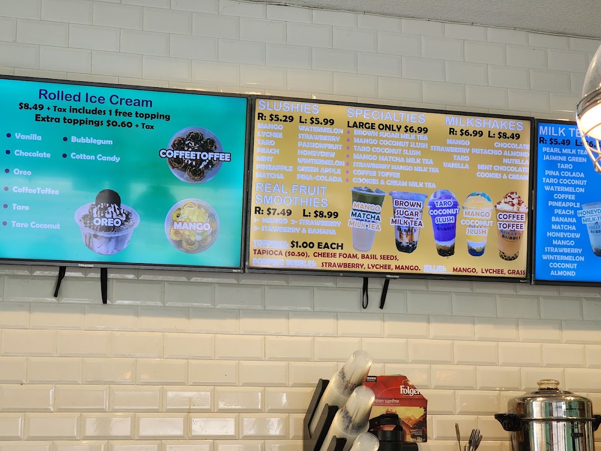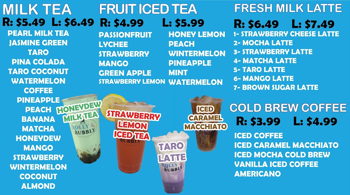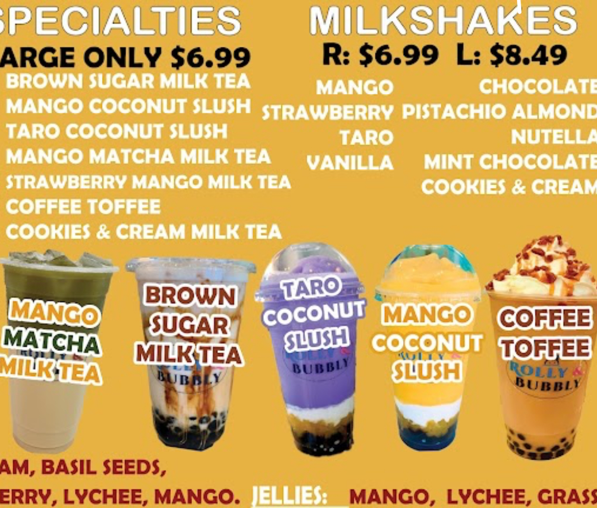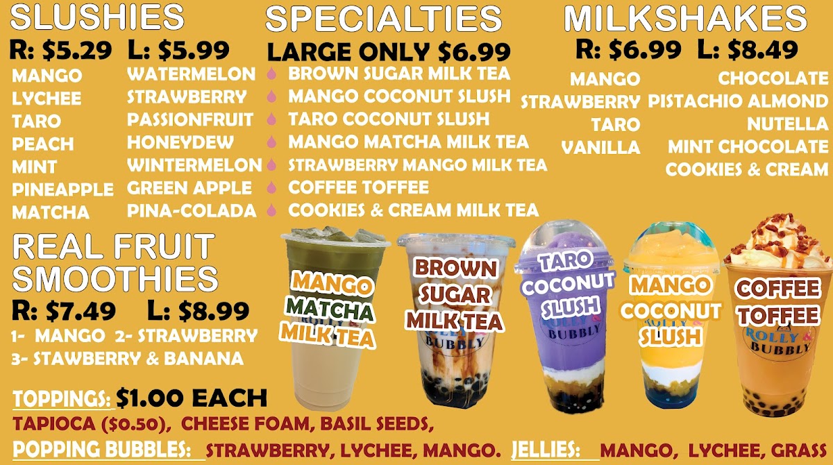 Rolly & Bubbly offers a delightful variety of drinks, perfect for anyone looking to cool down or indulge in a sweet treat. For milkshake lovers, the Strawberry Milkshake and Taro Milkshake are standout options, with the Oreo Cheesecake Milkshake adding a unique twist. Slushie enthusiasts can enjoy refreshing choices like the Pineapple Slushie or the Mint Slushie, while the Wintermelon Slushie and Watermelon Slushie provide vibrant flavors. Their milk teas, including the creamy Coconut Taro Milk Tea and the fruity Mango Milk Tea, offer something for every taste. For those craving something a bit more special, their large-only specialties like Brown Sugar Milk Tea and Strawberry Mango Milk Tea stand out as rich and flavorful options. The Iced Vanilla Cold Brew and Iced Caramel Macchiato cater to coffee lovers, with both providing a smooth, refreshing pick-me-up. Fresh milk lattes such as the Taro Latte and Brown Sugar Latte provide a cozy, comforting alternative to the usual iced drinks. For a fruity twist, the Strawberry Lemon Fruit Ice Tea and Mango Fruit Ice Tea are vibrant and perfect for warm days. With its expansive drink selection, Rolly & Bubbly truly offers something for every preference, making it an ideal stop for a refreshing beverage or indulgent treat.